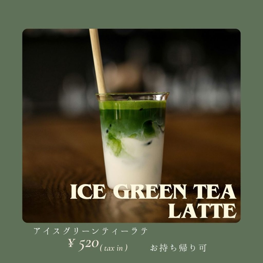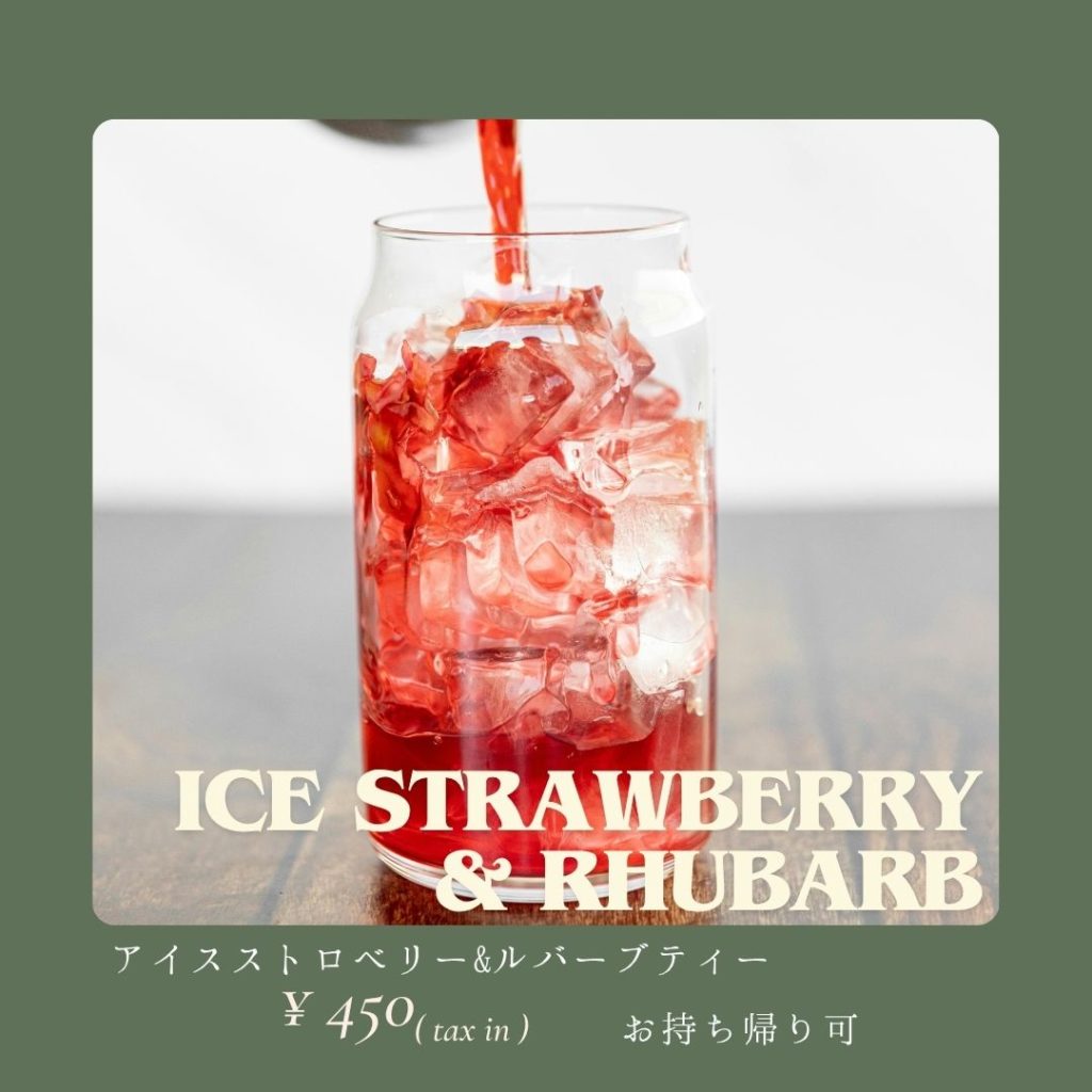 ドリンクは緑にちなんだアイス抹茶ラテもご用意。その他ルバーブといちごのアイスティーも提供します。